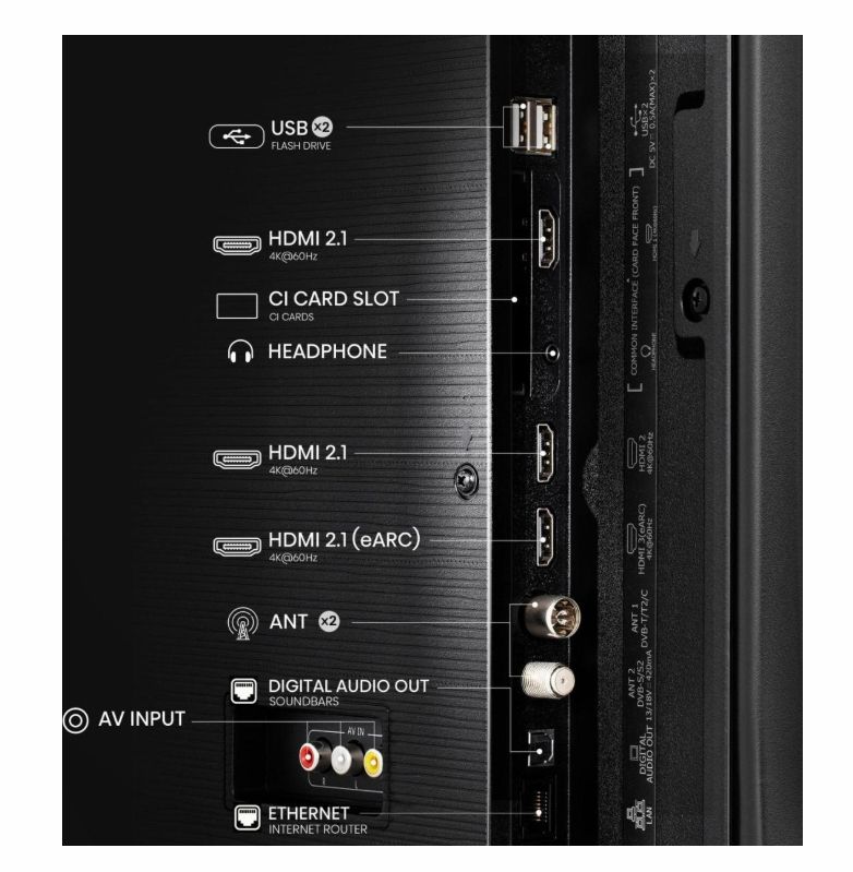 Изводи за свързване:3 HDMI, 2 USB, S/PDIF out, CI+ Slot, 2 RF In, Audio (L/R) in